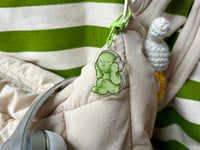acrylic keychain with rotating green clasp, double sided artwork, and removable double sided plastic lining